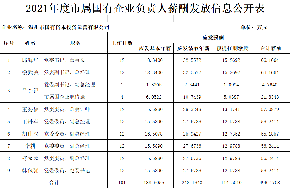 2021年度市属国有企业负责人薪酬发放信息公开表