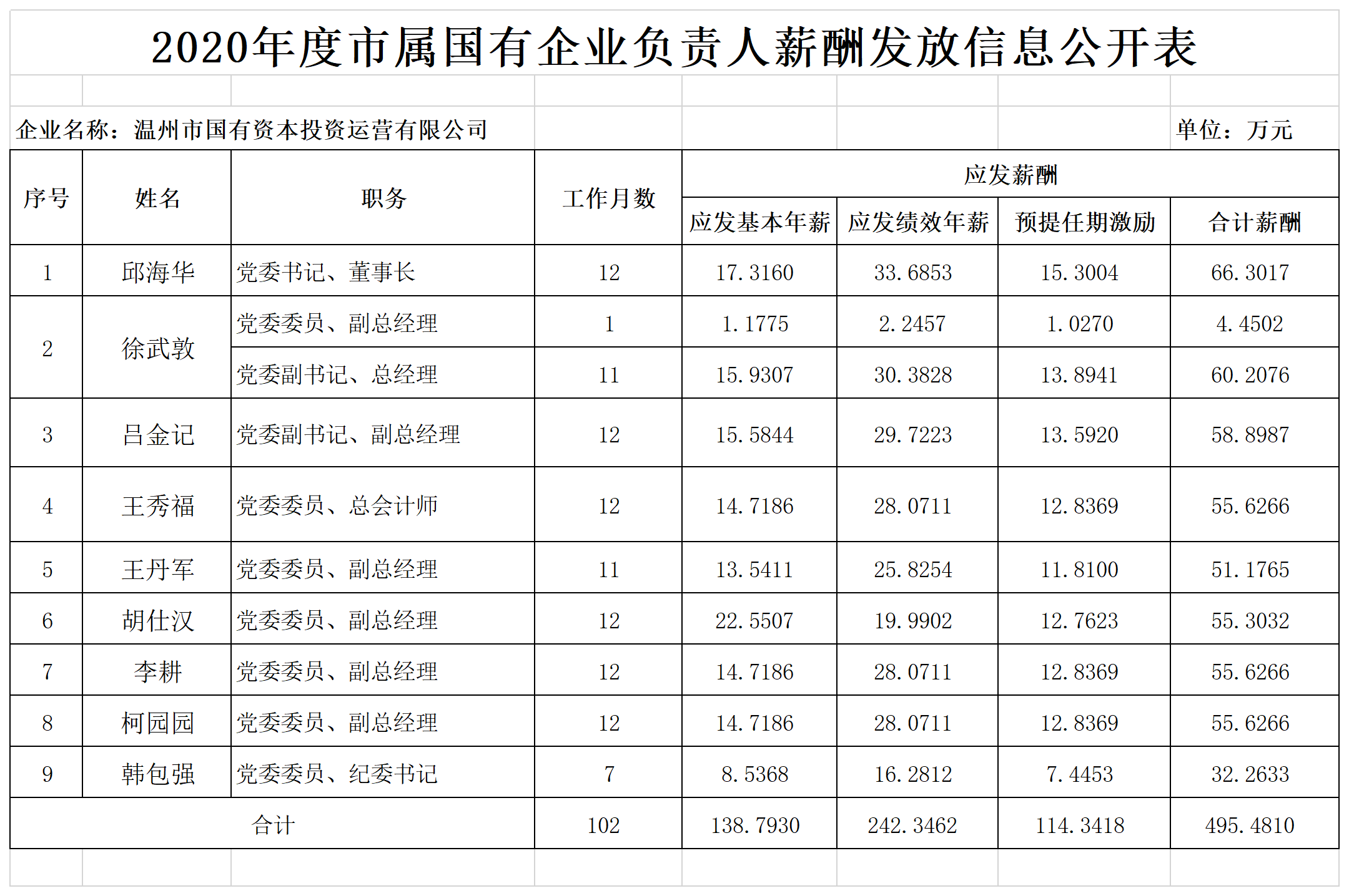 2020年度市属国有企业负责人薪酬发放信息公开表