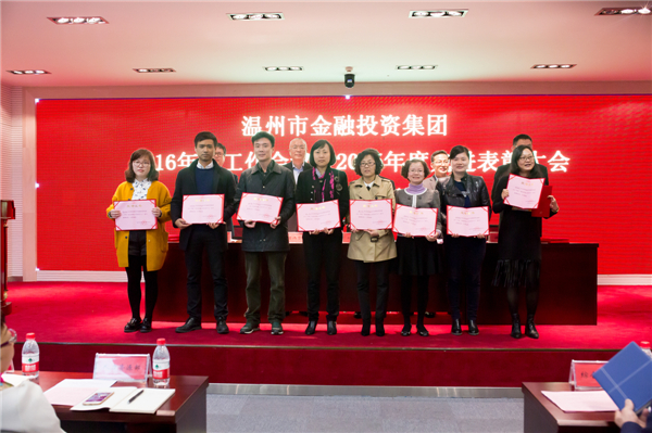 月7日上午,市金投集团召开2016年度工作会议暨2015年度先进表彰大会。会上,总经理邱海华就集团2015年工作成效及2016年工作部署作重点报告,各成员公司就完成2016年工作任务做表态发言,并签署经营业绩责任书。