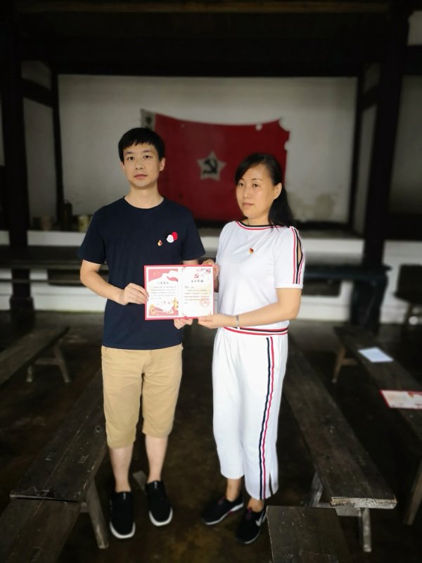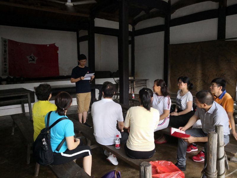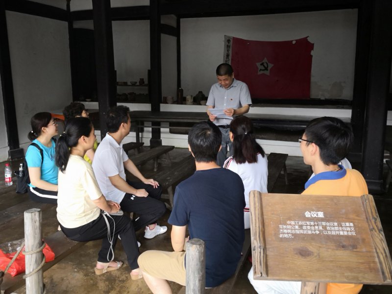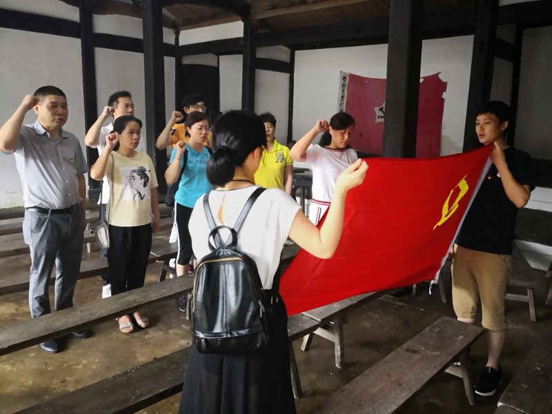 在红十三军军部旧址会议室,全体党员在党旗下重温入党誓词。支部为六、七月份入党的白荣贵、晏雪松两位同志过政治生日,发放生日贺卡。