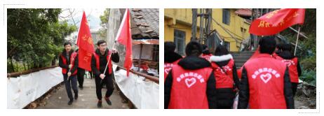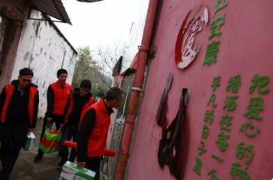 当天下午,党员志愿者们带着八宝粥、牛奶、蛋糕、帽子、袜子等慰问品和党的关爱,驱车到达永嘉县上塘镇浦东村龙山山脚下。