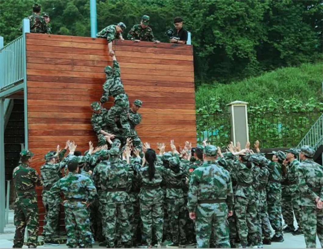 听从教官指挥,以军人的标准严格要求自己,练习稍息、立正、起步走等队列动作,步伐矫健,口号响亮,精神饱满。晚上,还进行了紧集集合和叠军被比赛;学唱《团结就是力量》《打靶归来》等军营歌曲,体验军营文化。进行“穿越电网、背摔、毕业墙、团队大比拼、画蓝图”等体现团队协作特色的经典项目,深入体会团队合作的力量。
