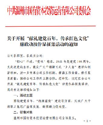 通知强调,2021年是中国共产党成立100周年,是“十四五”规划开局之年,是公司六个“勇争先”,续写创新发展史的重要一年,是落实"1256"纪检监察工作主线的关键一年,要激发广大干部职工的“主人翁”意识和创新精神,进一步完善公司工作机制、提高工作效能、提升服务质量,廉政动漫作品主题围绕建党百年、“清廉温资”建设等方面,反映广大干部职工集思广益谋发展,群策群力促转型。