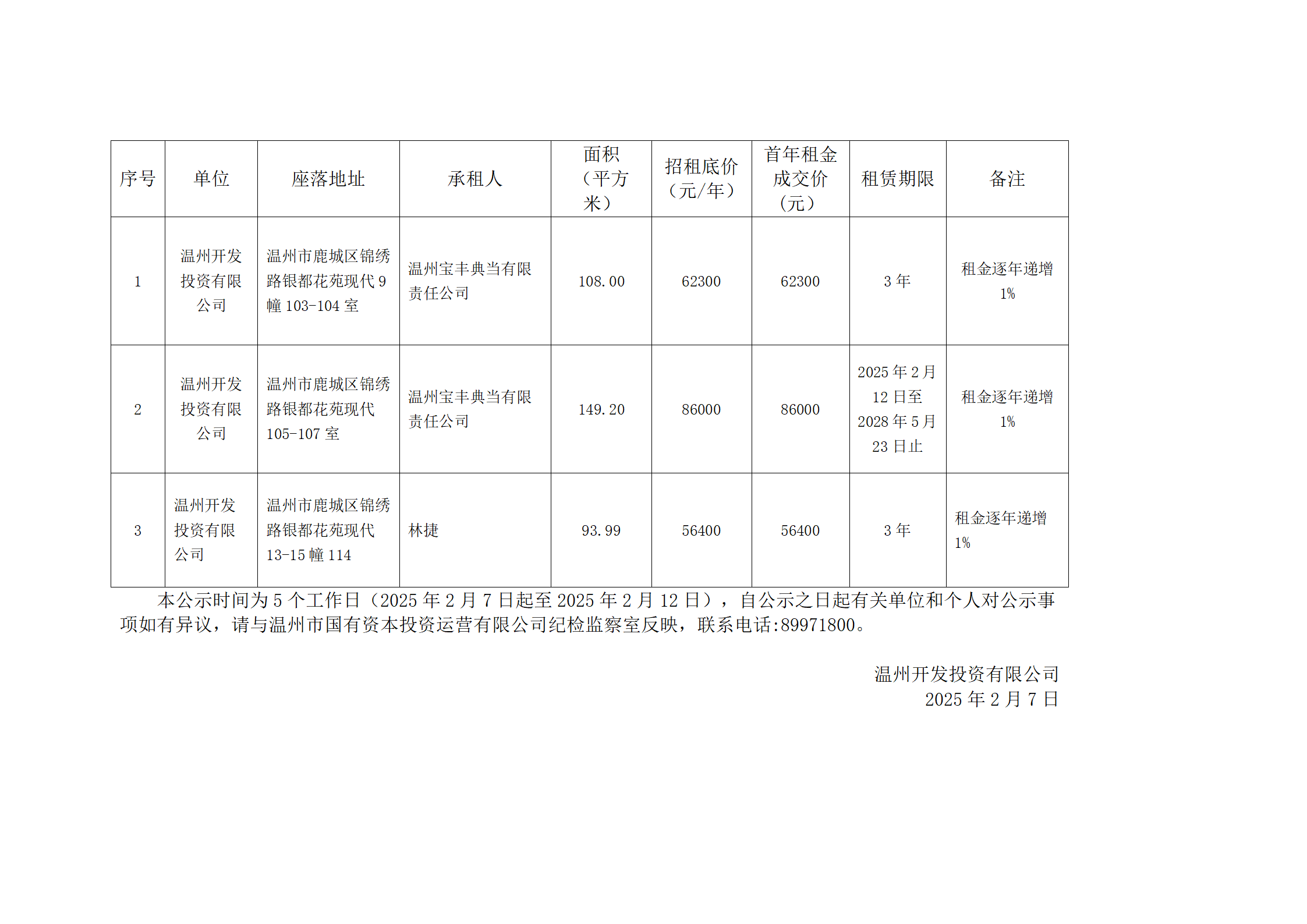 本公司坐落于温州市鹿城区锦绣路银都花苑9幢103-104室等房产于2025年1月23日-2025年2月5日公开招租,现已成交,现将出租情况公示如下: