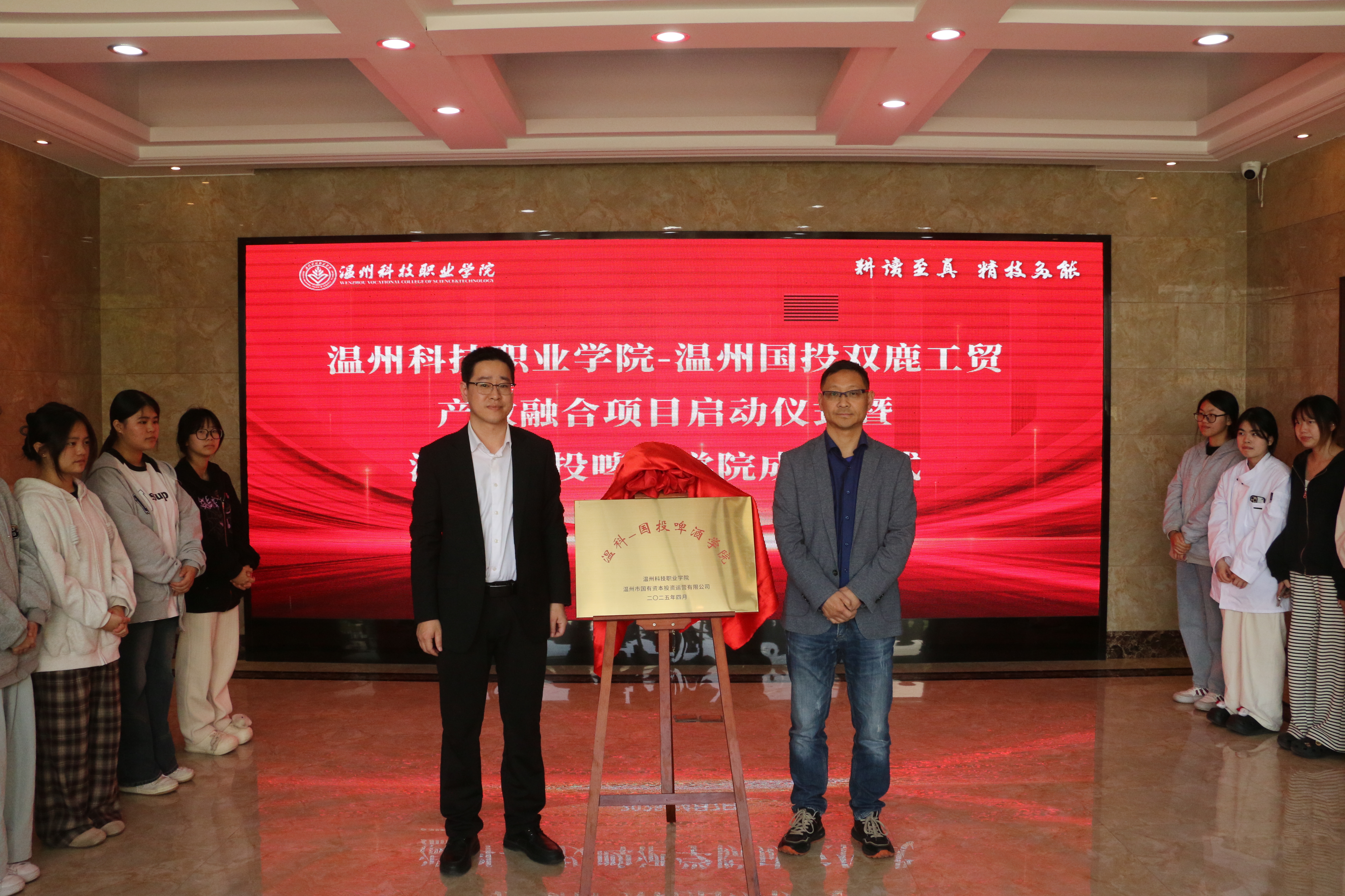 4月7日下午,成人在线直播 所属温州国投双鹿工贸有限公司与温州科技职业学院产教融合项目启动仪式暨“温科-国投啤酒学院”揭牌仪式在校食品中试基地隆重举行。该学院将依托企业技术优势与学院教育资源,打造国内精酿啤酒领域产教融合标杆平台,推动教育链与产业链深度融合。