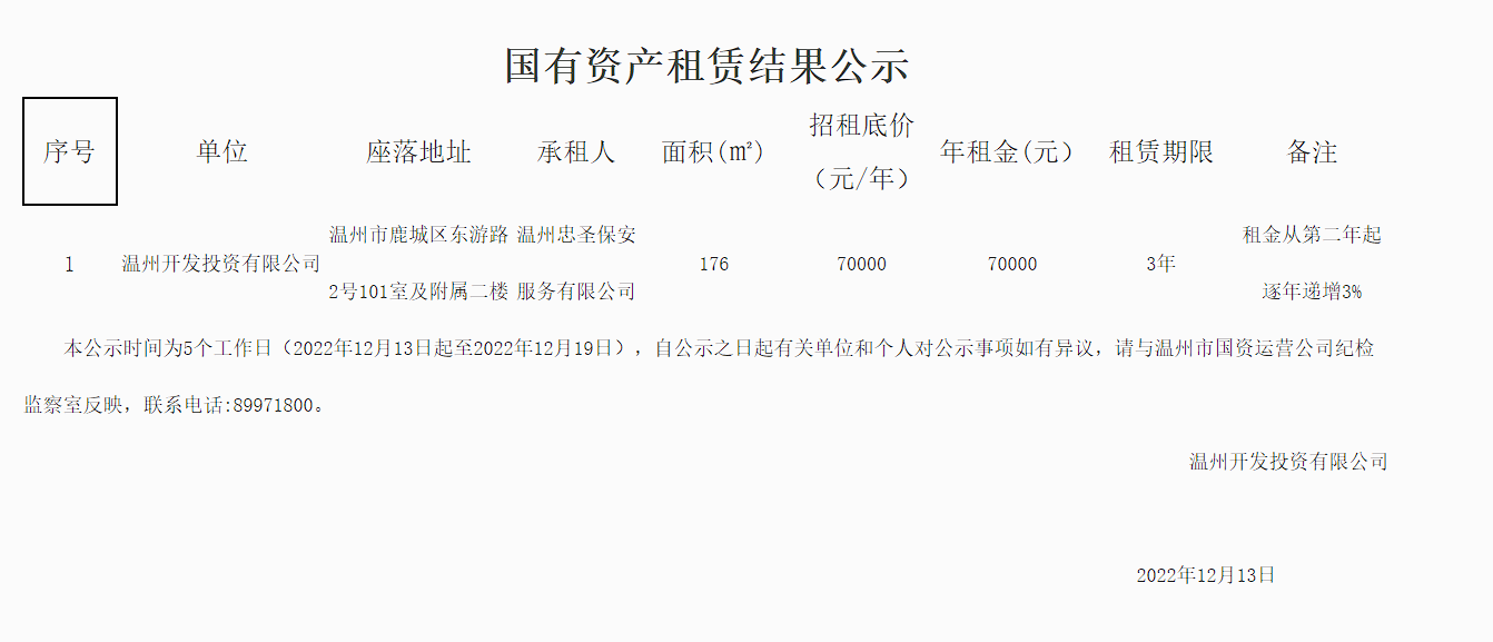 市国资运营公司下属温州开发投资有限公司关于温州市鹿城区东游路2号101室及附属二楼招租结果公示