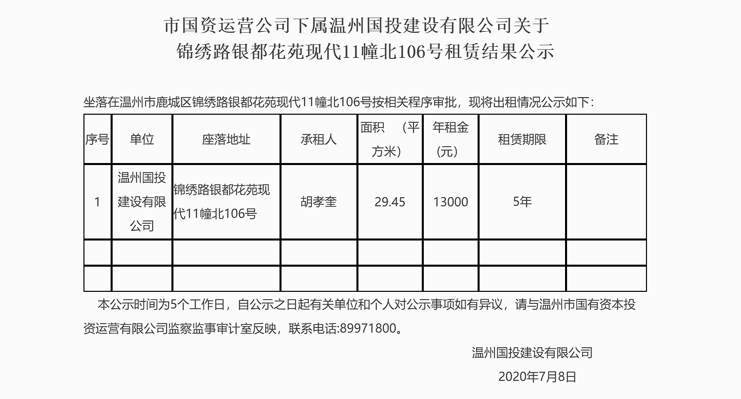 市国资运营公司下属温州国投建设有限公司关于 锦绣路银都花苑现代11幢北106号租赁结果公示