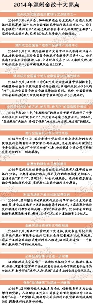 2014年是温州金改的深化之年,创新突破不断,在全国范围内率先探索和建立地方金融监管体制,持续推进民间融资走阳光化、规范化之路。2014年7月,以正泰、华峰两家温企为主发起人的温州民商银行获批筹建,温州成为全国首批民营银行试点城市之一。